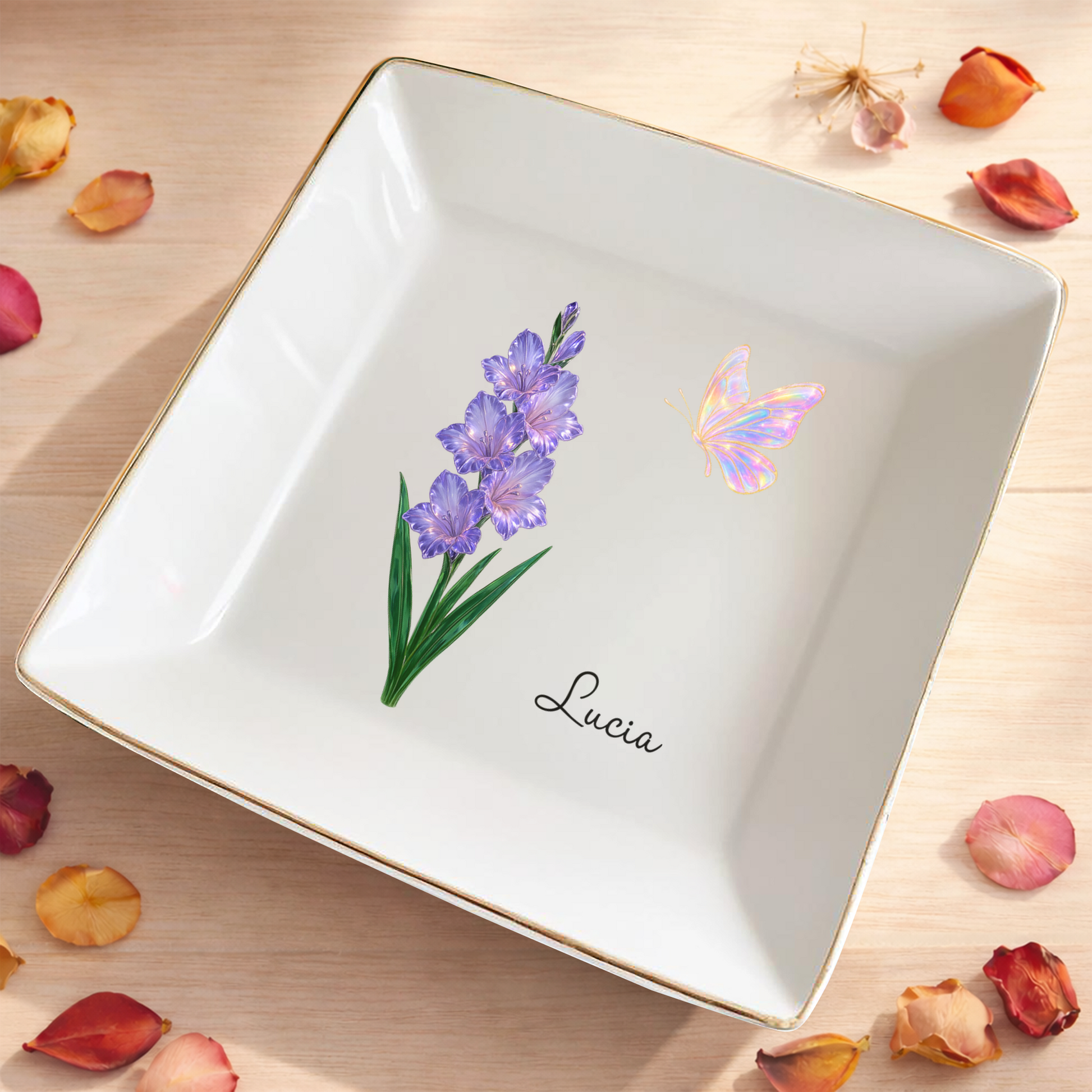 An elegant personalized flower jewelry dish designed to hold precious pieces—and even more precious memories. |